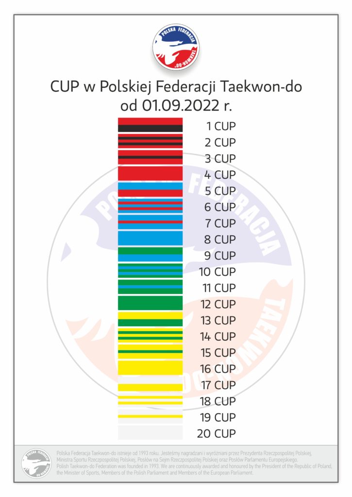W Taekwon-do tradycyjnym wyróżnia się stopnie uczniowskie, tzw. „CUP” oraz mistrzowskie, tzw. „DAN”. Stopniom CUP przypisany jest konkretny kolor i symbolika związana z rozwojem umiejętności adepta, jego drogą w Taekwon-do. Pomiędzy pasami kolorowymi występują pasy z belkami, są one stopniami przejściowymi. Adept posiada umiejętności wyższe od noszonego aktualnie pasa, ale nie jest jeszcze gotowy do egzaminu na pas w kolejnym kolorze. W czasie egzaminu obowiązują umiejętności i wiedza na stopień zdawany oraz wcześniejsze.